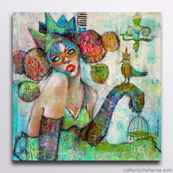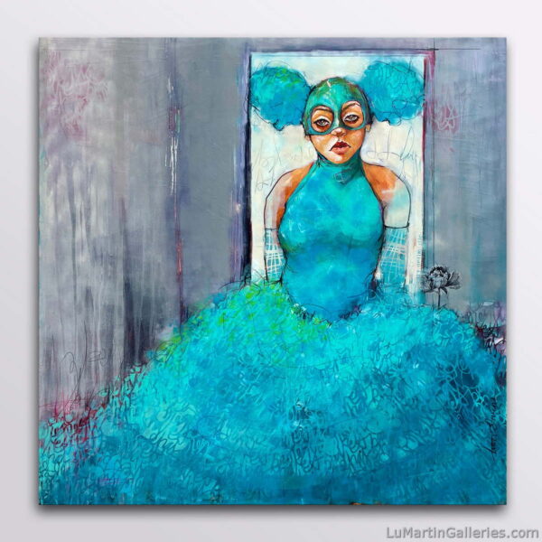 Each painting is an individual story. Words have amazing movement. All emotions that arise during the process, along with the emotional movement of each word are documented. At times throughout the process I tear up my notes/sketches regarding that particular painting and add them to my painting. I literally leave all my thoughts in each painting as to clear the path for the next plot. Sometimes the words are visible and sometimes buried. The characters are sometimes those I know, and sometimes from my head, but, always ready to make a bold statement, whatever the story unfolds.
